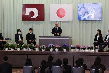 鬼塚校長が「新型コロナウイルス感染症の制限下でも、さまざまな工夫で乗り切った。予測困難の時代でも、ワイルドダック(野生の鴨)のように自ら考えて動き、それぞれの翼を大きく広げて羽ばたいてほしい」と式辞を述べました。〈※日本IBM理念 参照〉