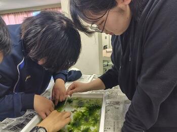 また、九州大学付属富岡臨海実験所に移動してブルーカーボンについての講義を受けました。海洋酸性化や地球温暖化の原因となる二酸化炭素を海藻が取り込んで酸素を出している様子や藻場にいる小さな生き物を観察したりなどを観察することができ生徒達は興味津々の様子でした。