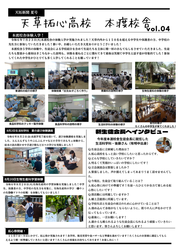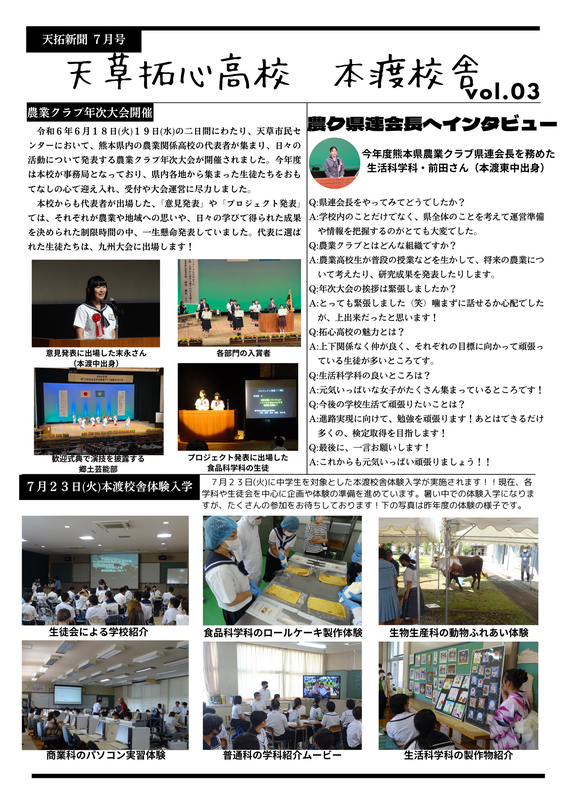 6月に天草市民センターで行われた学校農業クラブの年次大会の様子や、その運営の中心で活躍した生活科学科3年・前田さんのインタビューを載せています!