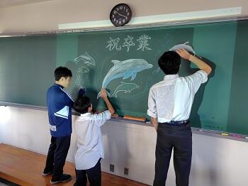 卒業式を前に、1・2年生が3年生の教室で黒板アートを制作しました。