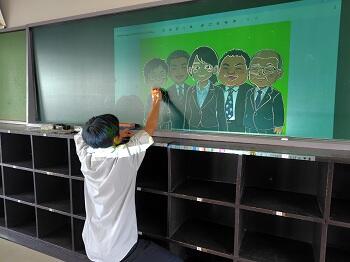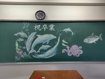 3学年の先生方のイラストをはじめ、マリン校舎らしくイルカを中心に描いたデザインが黒板いっぱいに広がり、教室は華やかな雰囲気に包まれました。