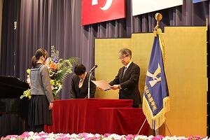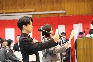 学年主任・担任の先生に続いて堂々と入場しました。呼名のあと、各学科の代表生徒に卒業証書が授与されました。校長式辞や来賓祝辞、祝詞など多くのはなむけの言葉をいただきました。それぞれの校舎を代表し、在校生2名による送辞、卒業生2名が答辞を述べました。式に参加した2年生の「蛍の光」の歌、歌の伴奏、吹奏楽の演奏で華を添えました。後輩たちがこれからさらに学校を盛り上げてくれることでしょう。