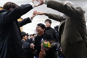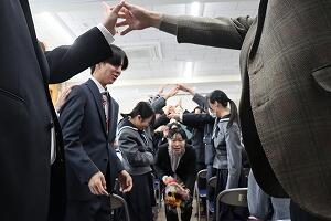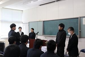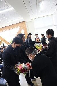 先生方お一人お一人がマリン校舎での思い出を語られ、「離れたところからも応援しているよ」とエールを送られました。生徒の代表が「学習面だけでなく日々の生活にも寄り添ってくださり、私たちの成長につながっている。これからも努力を重ねていきたい。先生方と過ごした時間は私たちにとってかけがえのない宝物。」とあいさつし、花束を贈りました。最後に元気に校歌を斉唱し、先生方を見送りました。