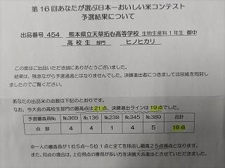 「あなたが選ぶ日本一おいしいお米コンテスト」は、審査員になった各家庭が5つの学校の米を食べ比べて審査をします。今年の決勝にエントリーされた6校の最高点は、25点満点で21点、最低点は19点でした。リニューアルされた天草拓心米は、1点足らずの18点のため、残念ながら決勝の6校にエントリーできませんでした。今回コンテストに参加したことで、南国天草でも、美味しいお米が栽培できることが分りました。また、今年の天草拓心米は、見事1等米でした。来年は、「ひのひかり」から、もちもち感で人気の「ミルキークイーン」に切り替えますので、ぜひともご期待ください。