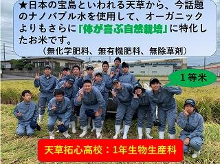 本校では、創立102年目で初のお米コンテストにチャレンジしました。今年の天草拓心米は、「無化学肥料」「無有機肥料」「無除草剤」での栽培で、水田に入れたのは今話題のナノバブル水のみ。オーガニックよりもさらに、「体が喜ぶ自然栽培」に特化して栽培しました。