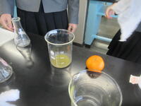 果汁を絞り、希釈して試料溶液を作り、滴定を行いました。