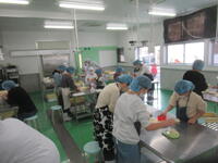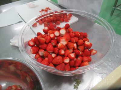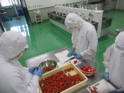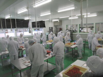 このイチゴは、イチゴジャムの原材料で、2学年合同でヘタや不可食部を取り除く、下処理を行いました。