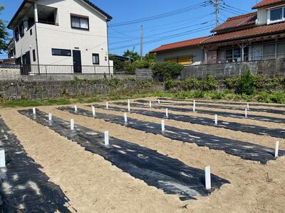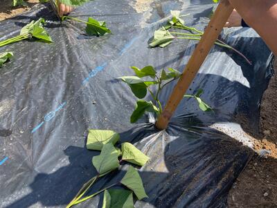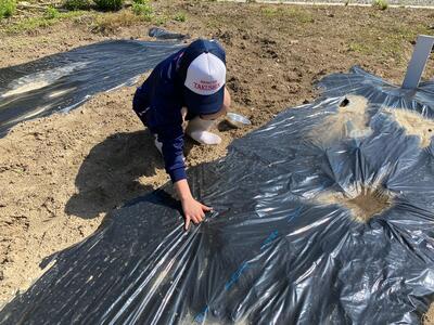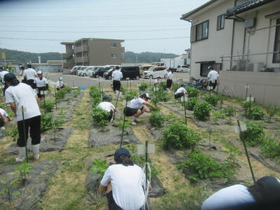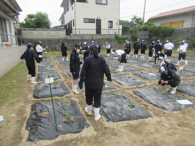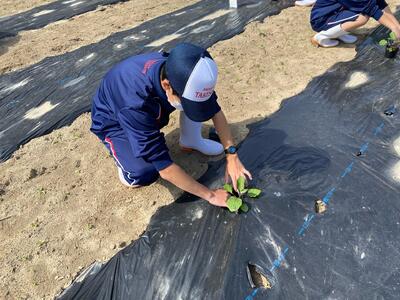 先週のトウモロコシの播種に引き続き、夏野菜の定植を行いました。