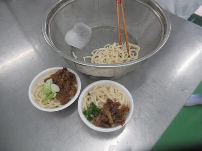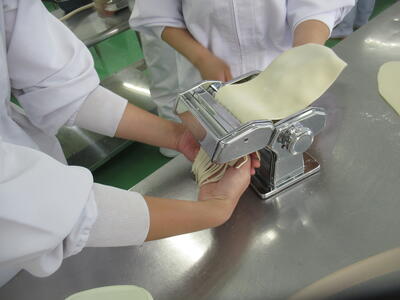 うどんは中力粉を用いて、製造を行いますが、今回2年生の食品製造の授業では薄力粉と強力粉を同量使い、うどん麵の製造を行いました。
