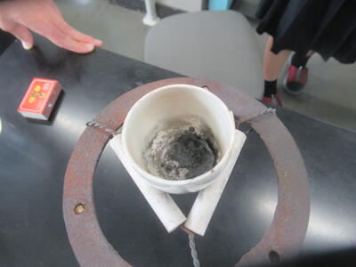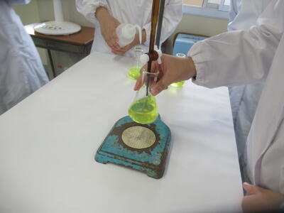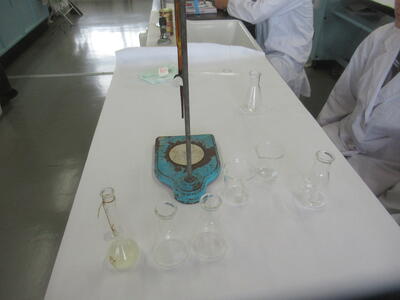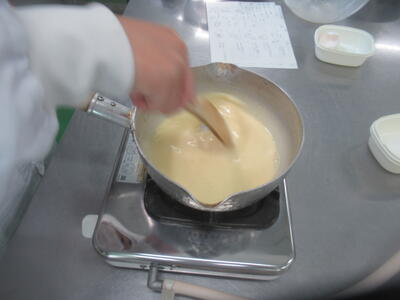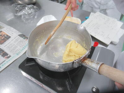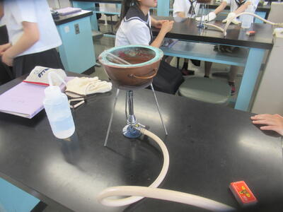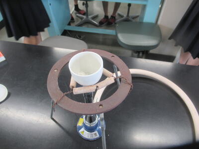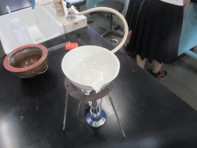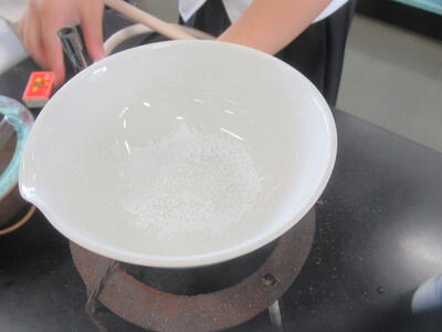 湯煎鍋を使って湯煎を行い、蒸発皿を使って蒸発させる練習を行いました。