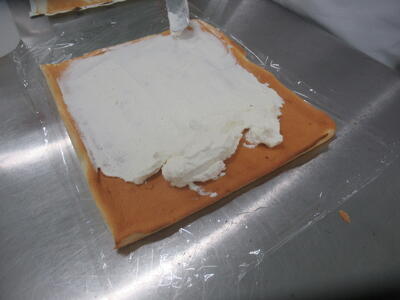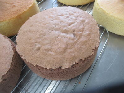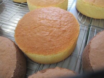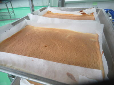 初めての共立て(スポンジ生地を作るときに、卵黄と卵白を分けず全卵で泡立てる方法)による製造で、苦戦しましたが、高さのある生地ができました。