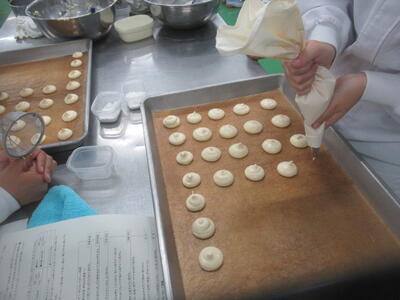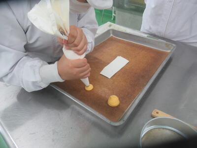 早速、食品製造の授業ではシュークリーム製造実習を行い、2人1組で生地製造者とクリーム製造者で実習内容を分担して製造しました。