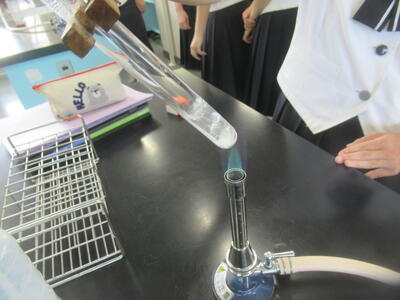 試験管の過熱を行いましたが、突然、沸とう(突沸)するのを防ぐため、試験管の中に、沸とう石を入れました。