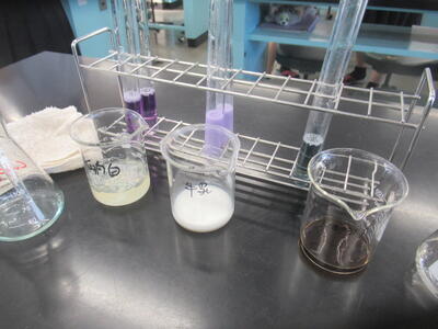 アミノ酸やたんぱく質の存在を確認する、定性実験を行いました。