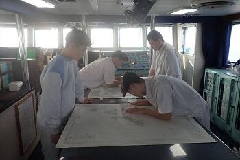 1月17日(土)は、長崎県出島岸壁に停泊し、第6次航海後半に向けた航海計画の作成を実施しました。海図や航海計器への入力は、生徒が中心となって行い、目的地のみを指定した上で、航路や運航方法を自ら考える実践的な内容です。実際の航行を通して改善点を見つけ、より安全で効率的な航海につなげていきます。