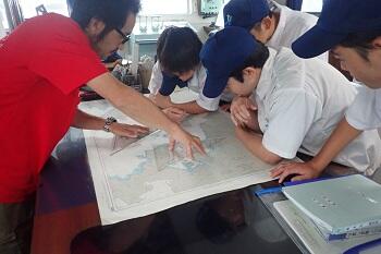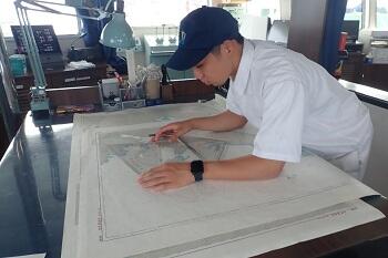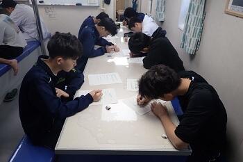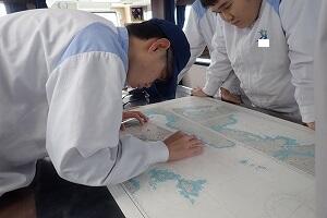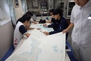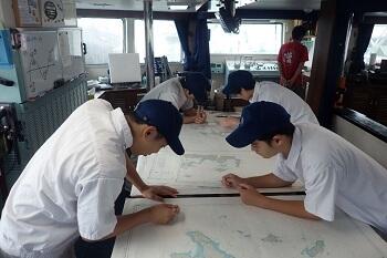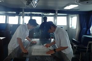また、方位や海図を用いた位置測定の訓練も行い、航海計器が使用できない状況を想定した基礎的な技術の習得を図りました。