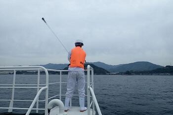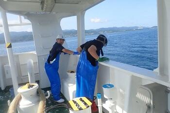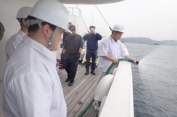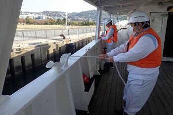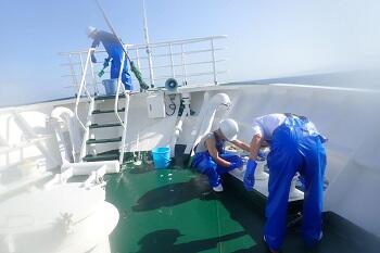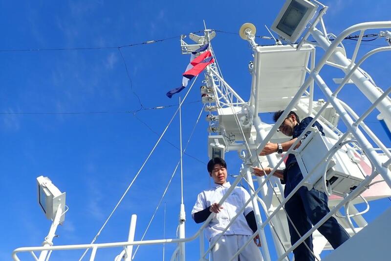 ⾧崎県⾧崎港内に錨泊。航海もまもなく終了となるため、船体の掃除を行いました。魚のウロコなどが残らないようにすみずみまで磨き綺麗になりました。