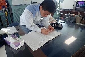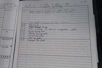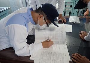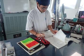 ⾧崎県⾧崎港内に錨泊。船⾧や一等航海士に教わりながら訓練記録簿を記入しました。訓練記録簿は海技士の資格習得の際に提出する重要な書類となります。