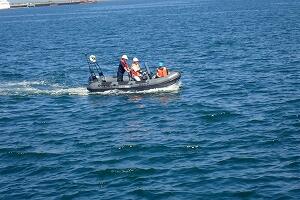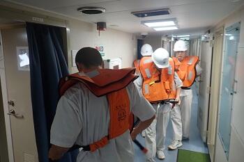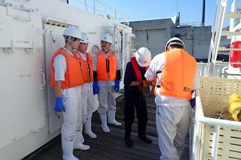船の喫水について座学で学び、実際に読み取る練習をしました。小さい波でも読み取るのが難しくなるため、苦戦していました。午後3時に出港予定です。