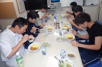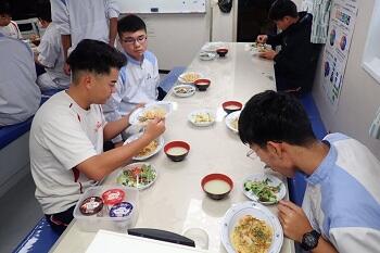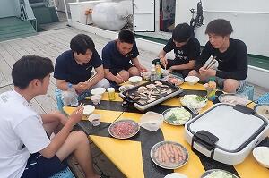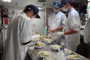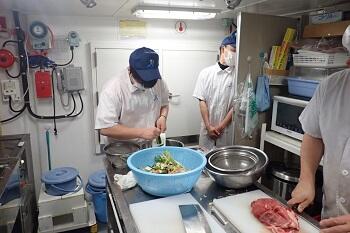 約5時間の航行中、操舵の練習をしました。船⾧の操舵号令に合わせて、正確に速く舵を切らなければならず緊張した様子でした。また、食事は手間暇をかけてホテル並みの料理を作ります。おいしくいただきました。