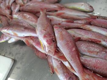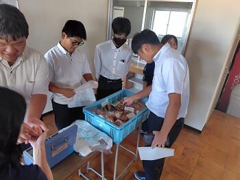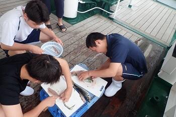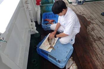 一つ目は「釣獲実習」です。 仕掛けにルアー(疑似餌)と生き餌を使い、見事フエフキダイやカサゴを釣り上げることに成功しました! ただ、今回は生き餌への食いつきが今ひとつだったようで、学生たちからは「今度こそ大物を」と、リベンジに燃える声が上がっています。