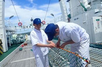 航海中、 生徒たちは航海計器の操作、航海計画の作成、気象観測、船内当直、衝突予防法など、海技従事者として必要となる実践的な訓練を行います。さらに、釣り漁業や一本釣りを中心とした漁業実習、日直業務による船内環境整備など、船内生活全体を通して協働性と責任感を養います。