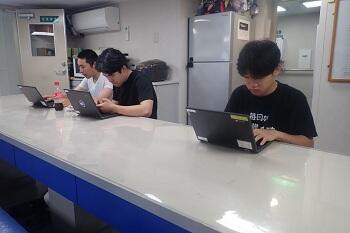 前日の強風と波浪の影響を心配していましたが、幸いにも今朝は海が穏やかな「凪」となりました。船酔いの心配もなくなり、学生たちは朝から元気に座学の課題などを進めています。