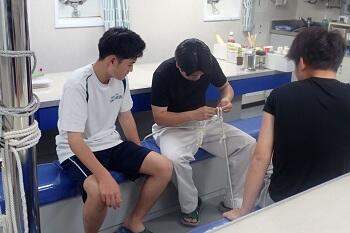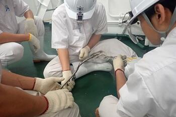 タラップ(船に乗るときに使う橋)の網を作り始めました。一年生の時以来の編網でしたが、スムーズに作業を行いました。