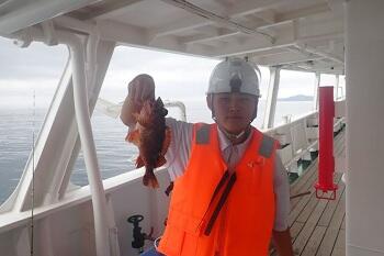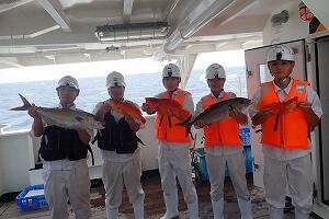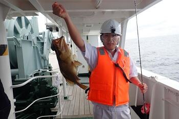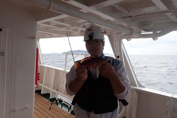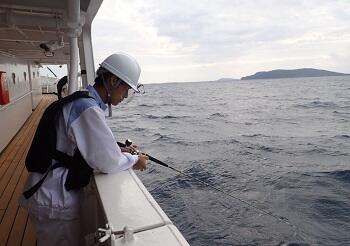 飯盛沖では釣獲実習を行い、カサゴやアオハタなどを釣り上げました。釣れた魚はその日の夕食に刺身として提供され、航海中ならではの貴重な体験となりました。