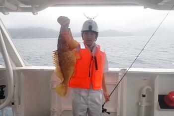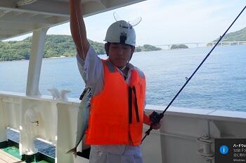 五島列島有川湾には午後1時に錨泊し、航行中には生徒が操舵訓練に取り組みました。まだ慣れない操作に苦戦しながらも、慎重に操船し、安定した航行を行うことができました。錨泊後は直ちに漁業実習を実施し、アオハタやカンパチの釣獲に成功しました。