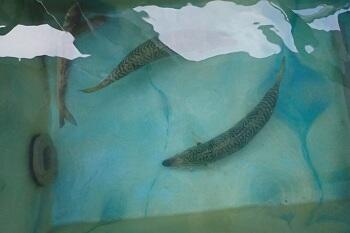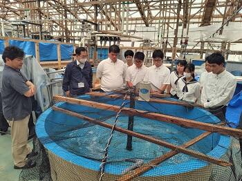 また、長崎市水産センターでは、水産ブランド魚「ゆうこうシマアジ」「ゆうこう真鯛」について学習しました。これらは、長崎市の伝統柑橘「ゆうこう」を混ぜた餌で育てた長崎市初のフルーツ魚です。