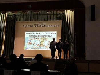 10月31日、大分県立海洋科学高等学校で開催された「第42回九州地区水産・海洋高等学校生徒研究発表大会」において、マリン校舎食品系の生徒3名が出場し、「地域連携による水産版フェアトレードへの挑戦〜持続可能な水産物の利用を目指して〜」をテーマにスライド発表を行いました。その結果、最優秀賞という大変栄誉ある賞を受賞しました。