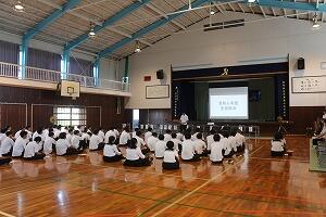 10月の全校集会を行いました。期末考査が終わり、マリン祭まであと10日となりました。今日からは、マリン祭体育部門の全体練習もスタートします。生徒会執行部が「マリン祭のテーマ『感恩報謝~支えてくれたすべての人に感謝~』に向けて、みんなで力を合わせてがんばろう」と呼びかけました。