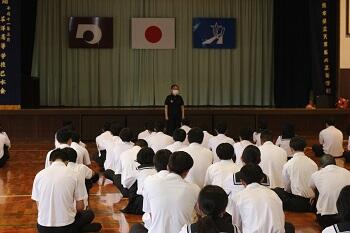 全校集会では、生徒会役員から6月の目標の「中間考査の反省を生かし、計画的な学習に取り組むと生活習慣を見直し、体調を整える」の2つが述べられました。