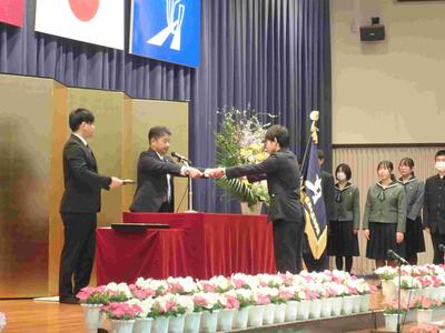 表彰式では、全国商業高等学校協会4種目1級合格者や三か年皆勤者等、3年間様々な場面で活躍した、のべ115名の3年生の努力をたたえました。