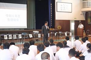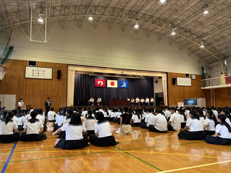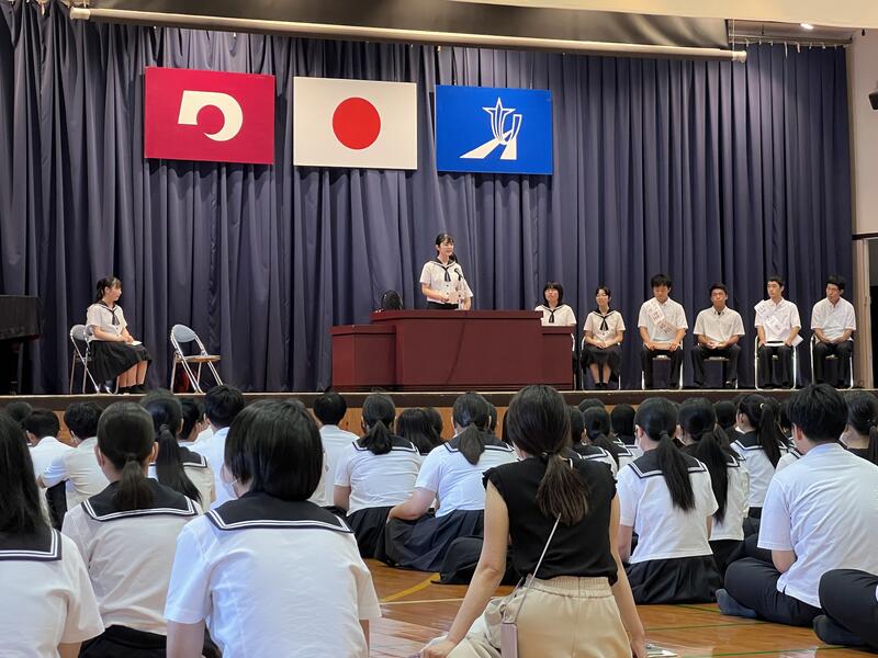 生徒総会が開かれました。会のはじめに、前期乗船中の生徒会長からのメッセージが代読され、会への主体的な参加を呼びかけました。
