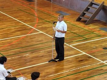 全校集会では、今月の目標である「夏バテに負けるな!」の提言やメディア委員会から夏休みの本の貸し出しについてのほかに、今週金曜日に行われる生徒会役員選挙に向けての注意事項などが全校生徒に伝えられました。
