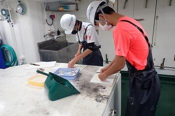 2年 海洋科学科 海洋航海コース「船舶運用」では、釣獲実習で学校近海に生息する魚を調べます。釣り上げた魚は、生徒たちがさばき自分たちで食べたり、先生方に販売を行っています。