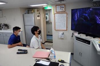 昨日14時に、港に入り調査に必要な資材の積み替えなどを行ないました。船内学習では、船体の構造や名称など、覚えることが多く大変苦労している様です(^_^;)。
