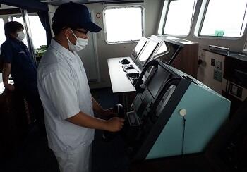 帰港中は、一等航海士と甲板長の役を決め、ウィンドラス(アンカーを投下したり、巻上げたりする揚錨機)操作などの実習を行いました。