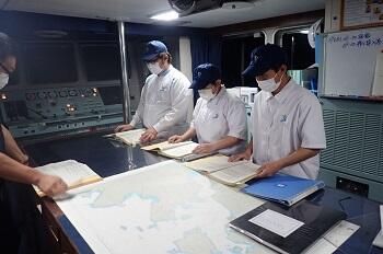 航海中は、船内学習やログブック記入などさまざまな体験を行います。この航海を乗り越えて、立派な船舶職員となれるように努力を続けていってもらいたいです。