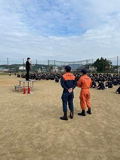 令和3年2月12日(金)本渡校舎にて、通報・消火・避難訓練が実施されました。避難後の全体会では、天草広域連合中央消防署から二名の隊員による全体講評と水消火器による消火器使用訓練が行われました。