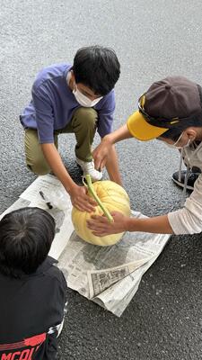 (パンプキンカービング本校で育てた大きなカボチャで、子どもたちとジャックオランタンを作りました