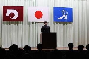 始業式の校長講話で鬼塚校長先生は「生徒の皆さんには、地域の方々や保護者さんなどいろんな方々に応援される人になってください。応援されるためには、自らどんどんチャレンジして今の学びを深められる人、そして人に思いやりを持って接することができる人になれるように心がけていってください。」と述べられました。