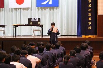 続いて行われた終業式では、鬼塚校長が駒澤大学附属苫小牧高等学校・野球部の冬季練習や、女子マラソン・高橋尚子さんの座右の銘などを紹介し「マリン祭や長距離走大会、修学旅行など行事も多かった2学期。周りに流されたりしなかっただろうか。高校生活は社会に出て活躍する準備の時期。冬休みは、自分を見直す機会にしてほしい。1月9日、全員で始業式を迎えましょう。」とあいさつしました。