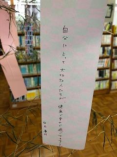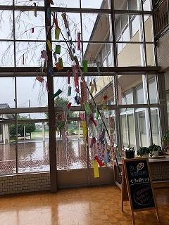 7月7日の七夕に向け、図書室内と前に二つの七夕飾りが飾られました。多く願い事が短冊に書かれ、願われています。