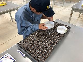 8月23日(金)生物生産科1年生の当番生にてキンギョソウの播種が行われました。ローズ、イエロー、ホワイトと3色の微細なキンギョソウの種子を200穴のセルトレイに丁寧にまきました。