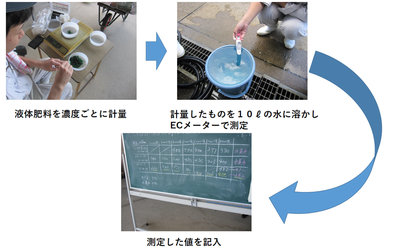実際に測定してみると、本校でかん水に使用している井戸水はEC値が高いことが分かり、こちらが予想していた値より高く、液体肥料のEC値もそのため、高い値となりました。