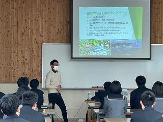 令和2年12月10日(木)農業大研修室にて生物生産科全学年を対象に、就農教育講演会が実施されました。講師に河浦高校OBの原田 孝平 氏をむかえ、「先輩からのメッセージ~農業の魅力について~」と題し、農業後継者の育成を目的とした講演会が行われました。原田 氏は、広島県のMAZDAで10年ご勤務されたのちに、故郷天草で実家の農業を次ぐためUターンされました。これまでの経緯や経験、今現在を高校生の目線でご講話されました。