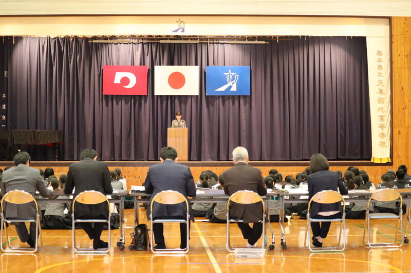 式では鬼塚校長が「『思いやりの心を持ってほしい。』、『夢なき者に成功なし(江戸時代の教育者・吉田松陰の言葉)』の2つの言葉を贈り、多様性を形作りそれぞれの個性を伸ばすとともに、具体的な目標を持ち行動してほしい。高校生活一日一日を大切に過ごしてほしい。」と式辞を述べました。